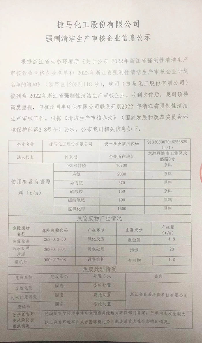 捷马化工股份有限公司强制清洁生产审核企业信息公示